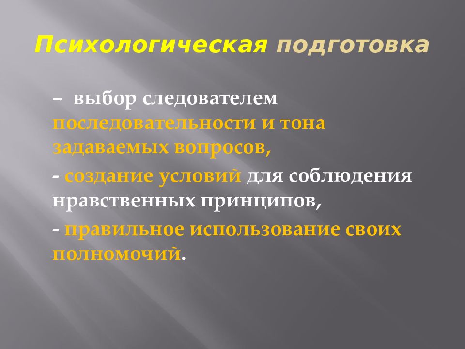 – выбор следователем последовательности и тона задаваемых вопросов, - создание условий для соблюдения нравственных принципов, - правильное использование своих полномочий.