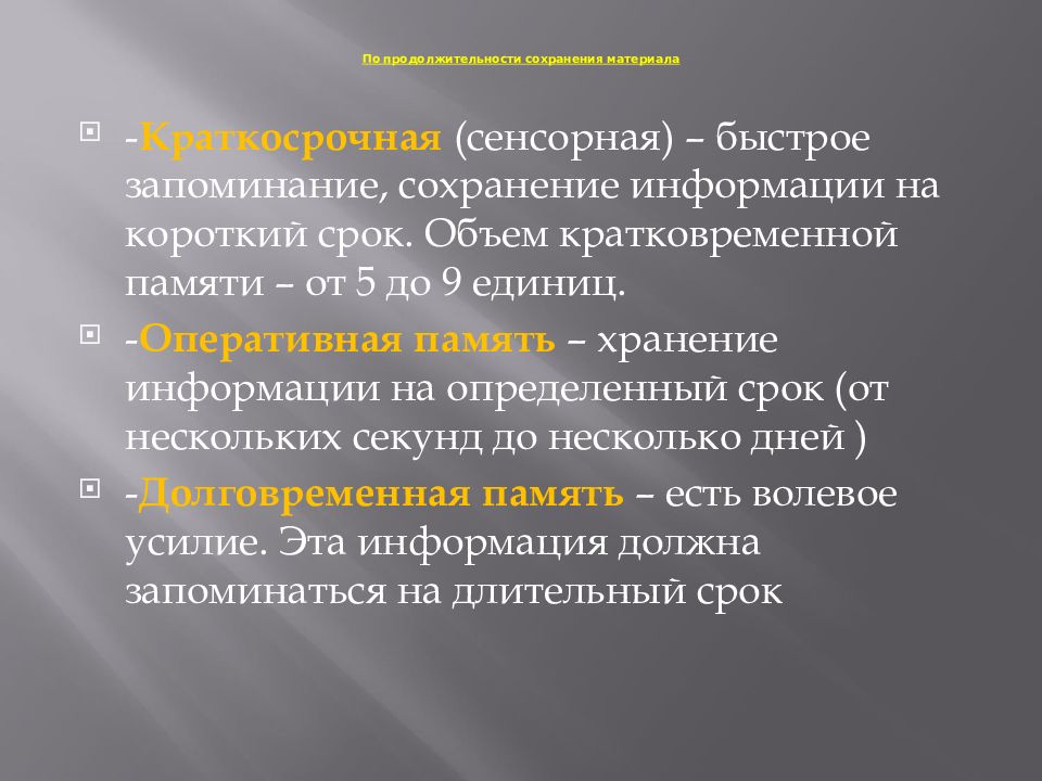 - Краткосрочная (сенсорная) – быстрое запоминание, сохранение информации на короткий срок. Объем кратковременной памяти – от 5 до 9 единиц. - Оперативная память – хранение информации на определенный срок (от нескольких секунд до несколько дней ) - Долговременная память – есть волевое усилие. Эта информация должна запоминаться на длительный срок