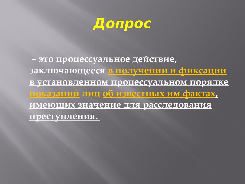 – это процессуальное действие, заключающееся в получении и фиксации в установленном процессуальном порядке показаний лиц об известных им фактах, имеющих значение для расследования преступления.