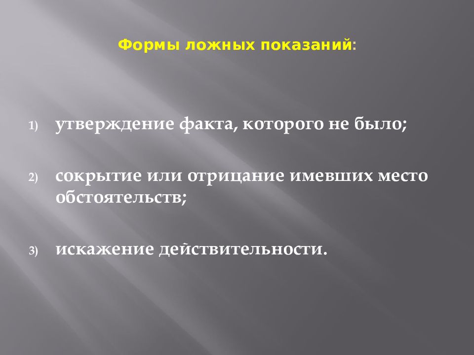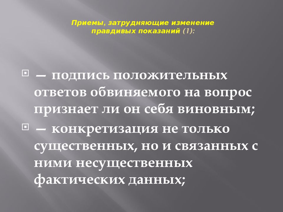 Слайд 40: Приемы, затрудняющие изменение правдивых показаний (1):
