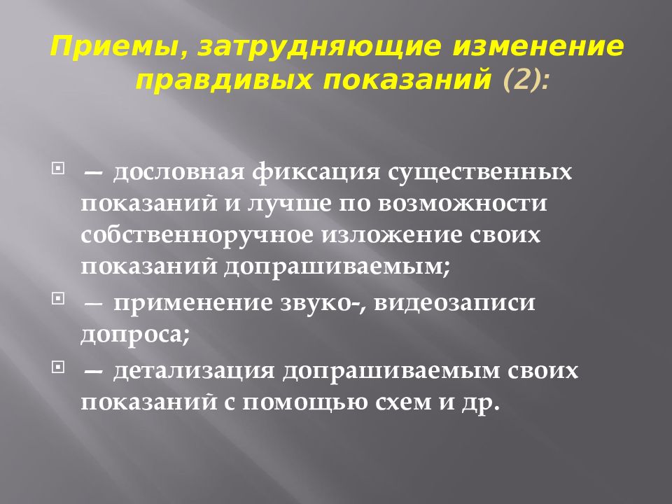 Слайд 41: Приемы, затрудняющие изменение правдивых показаний (2):