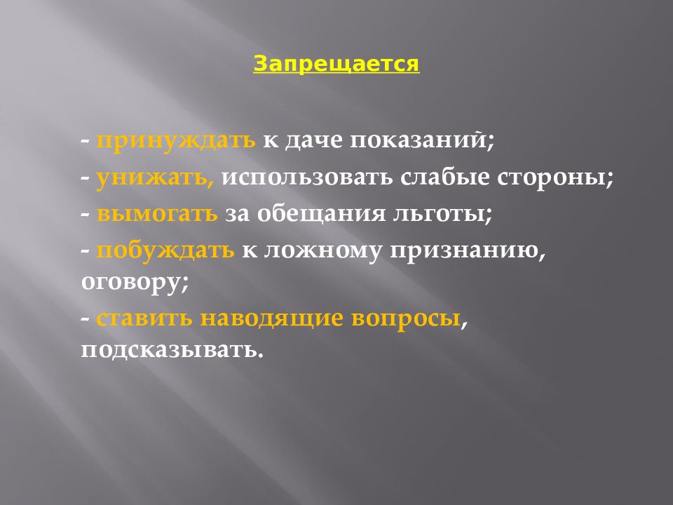 - принуждать к даче показаний; - унижать, использовать слабые стороны; - вымогать за обещания льготы; - побуждать к ложному признанию, оговору; - ставить наводящие вопросы, подсказывать.