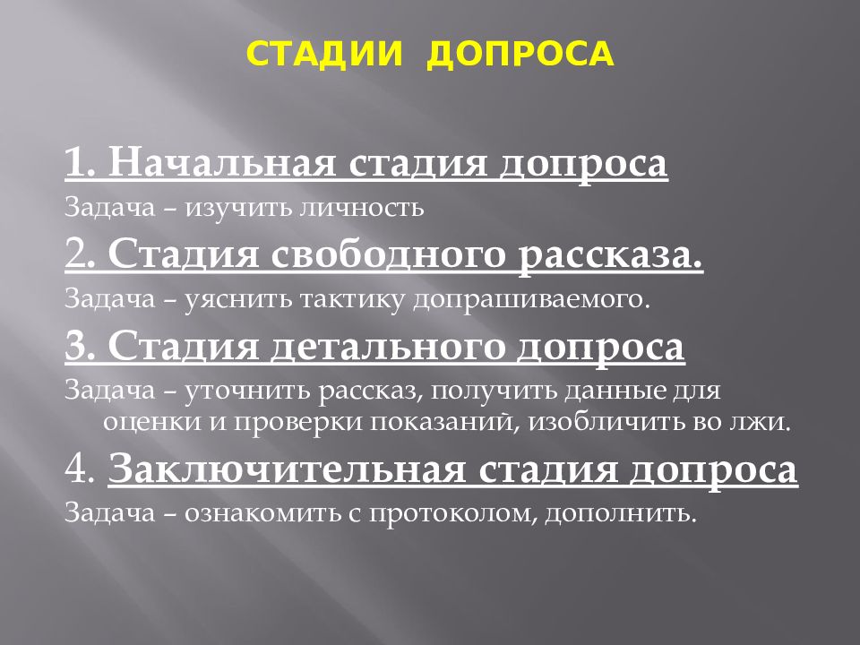 1. Начальная стадия допроса Задача – изучить личность 2. Стадия свободного рассказа. Задача – уяснить тактику допрашиваемого. 3. Стадия детального допроса Задача – уточнить рассказ, получить данные для оценки и проверки показаний, изобличить во лжи. 4. Заключительная стадия допроса Задача – ознакомить с протоколом, дополнить.