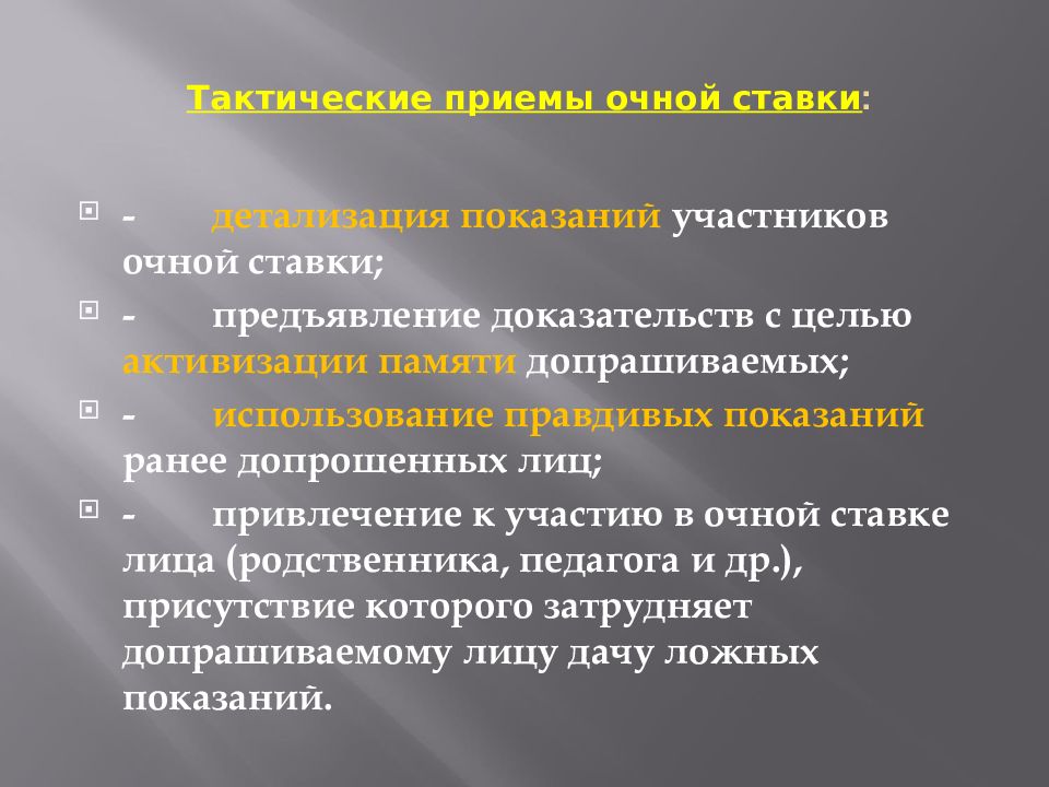 Последний слайд презентации: Этапы допроса, планирование допроса и очной ставки: Тактические приемы очной ставки :