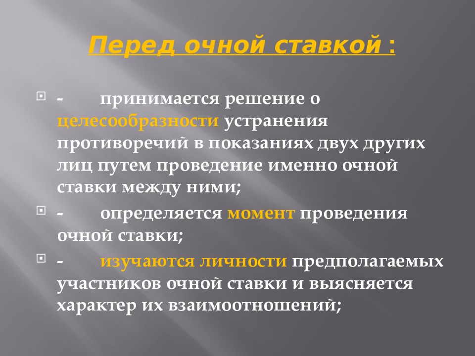 - принимается решение о целесообразности устранения противоречий в показаниях двух других лиц путем проведение именно очной ставки между ними; - определяется момент проведения очной ставки; - изучаются личности предполагаемых участников очной ставки и выясняется характер их взаимоотношений;