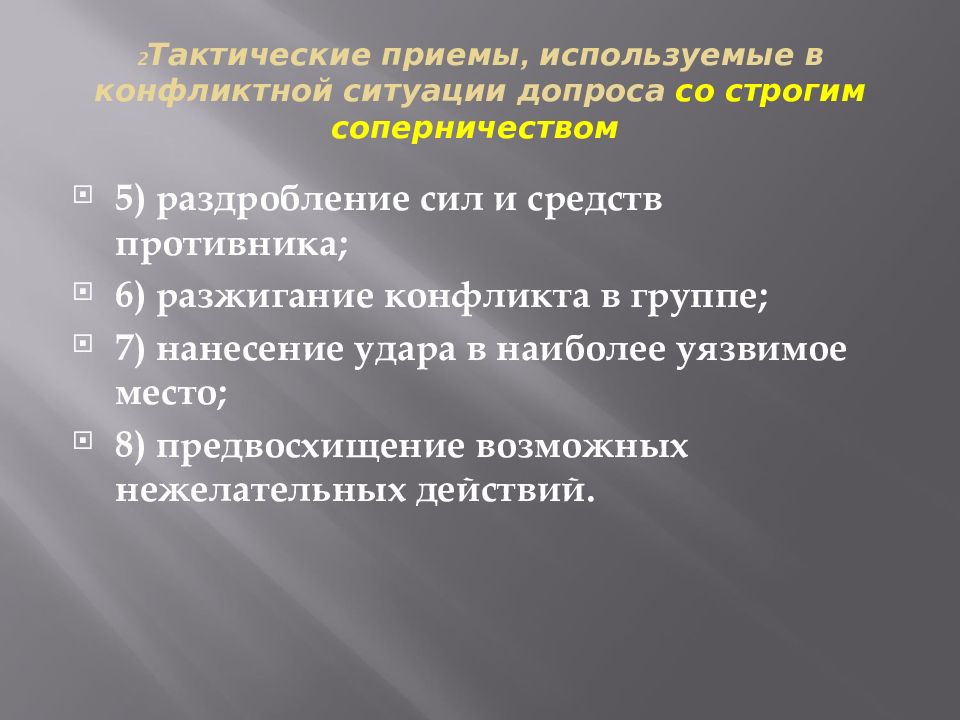 5) раздробление сил и средств противника; 6) разжигание конфликта в группе; 7) нанесение удара в наиболее уязвимое место; 8) предвосхищение возможных нежелательных действий.