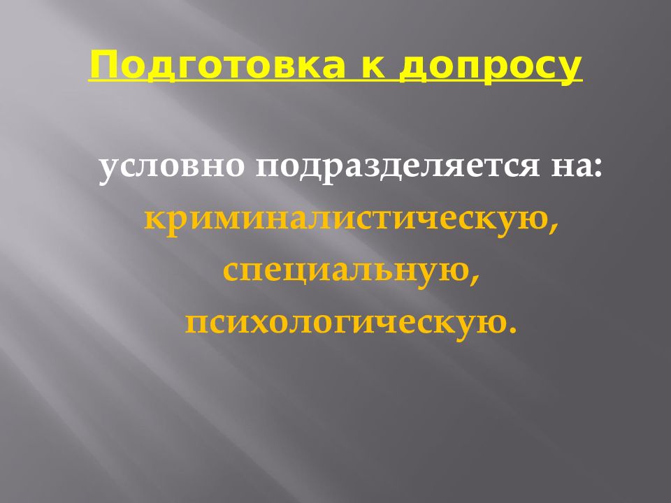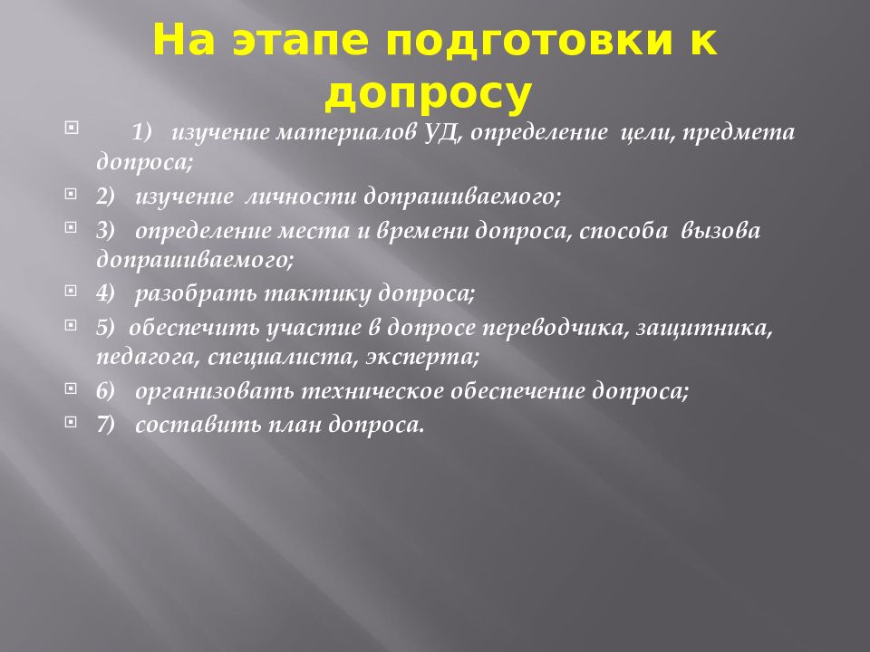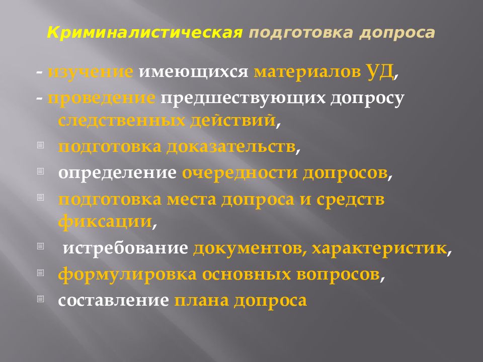 - изучение имеющихся материалов УД, - проведение предшествующих допросу следственных действий, подготовка доказательств, определение очередности допросов, подготовка места допроса и средств фиксации, истребование документов, характеристик, формулировка основных вопросов, составление плана допроса