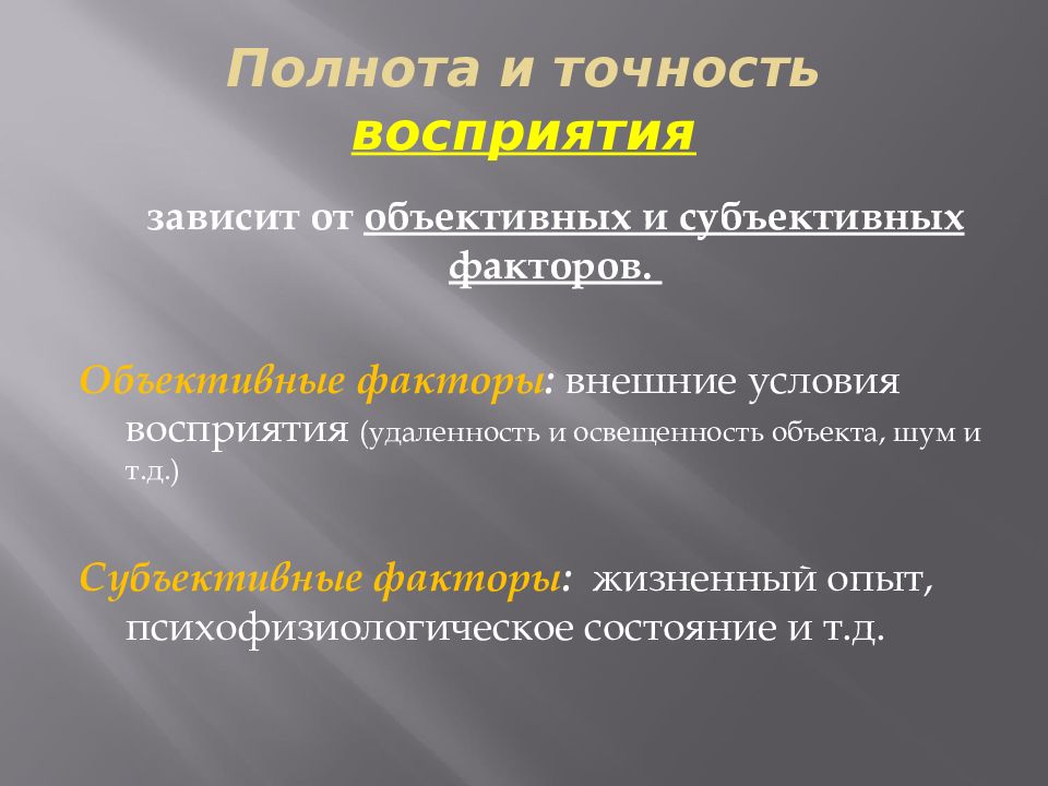 зависит от объективных и субъективных факторов. Объективные факторы : внешние условия восприятия (удаленность и освещенность объекта, шум и т.д.) Субъективные факторы : жизненный опыт, психофизиологическое состояние и т.д.