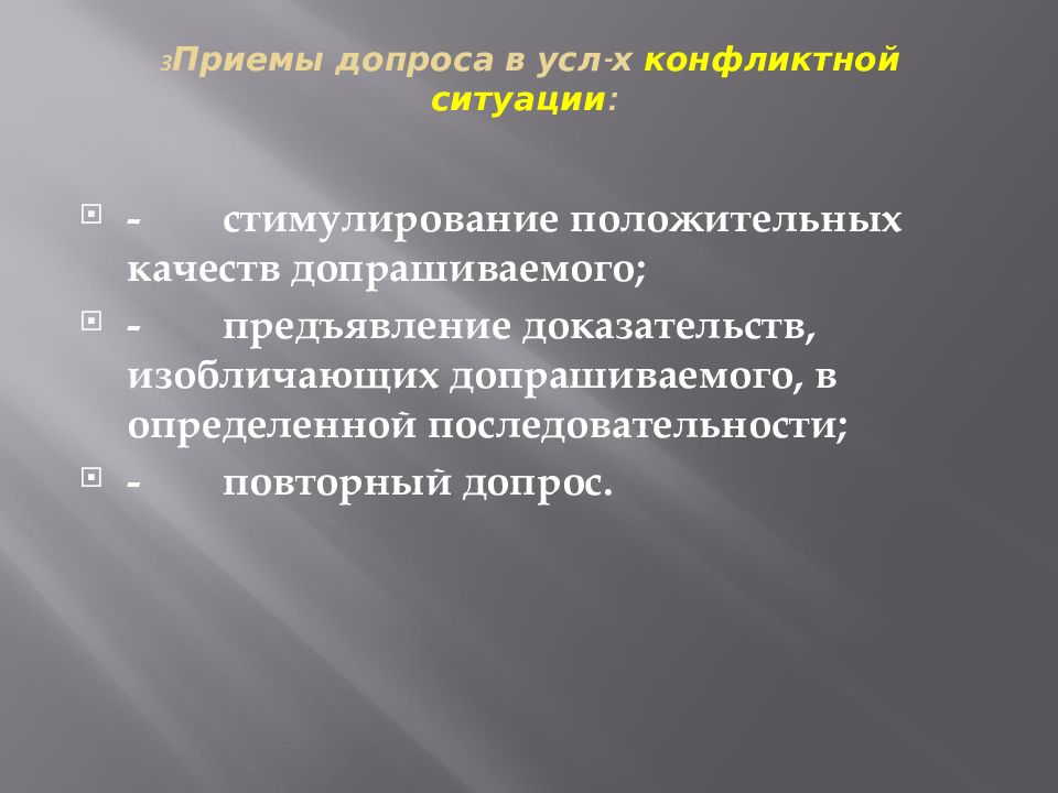 Слайд 35: 3 Приемы допроса в усл-х конфликтной ситуации :