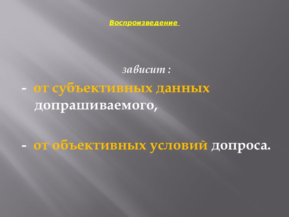зависит : - от субъективных данных допрашиваемого, - от объективных условий допроса.