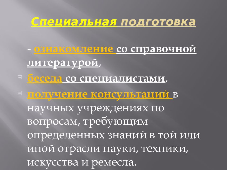 - ознакомление со справочной литературой, беседа со специалистами, получение консультаций в научных учреждениях по вопросам, требующим определенных знаний в той или иной отрасли науки, техники, искусства и ремесла.