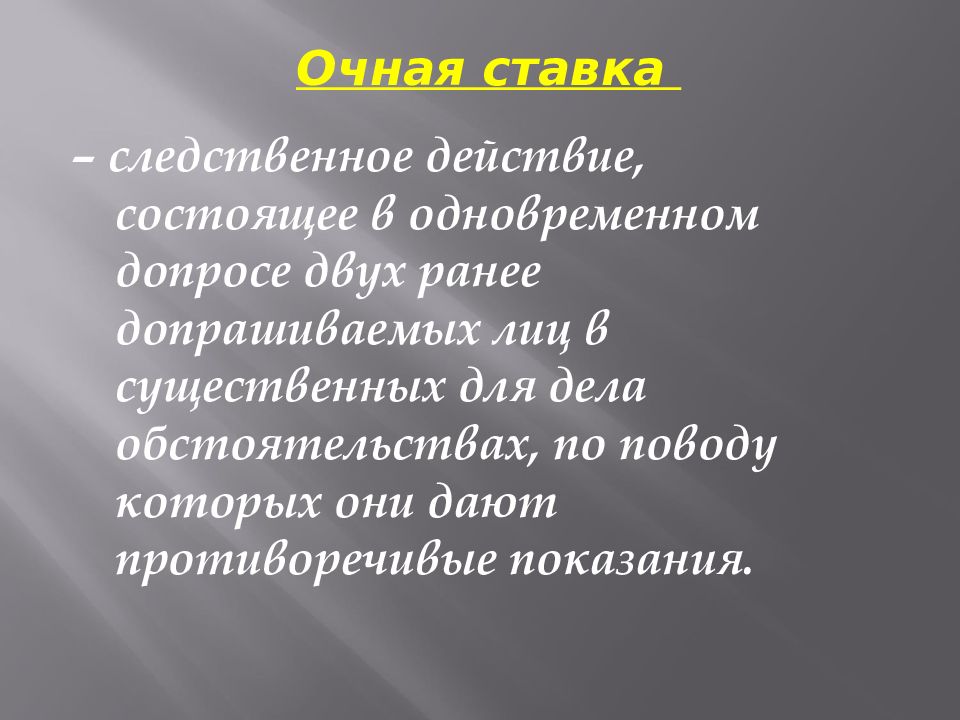 – следственное действие, состоящее в одновременном допросе двух ранее допрашиваемых лиц в существенных для дела обстоятельствах, по поводу которых они дают противоречивые показания.