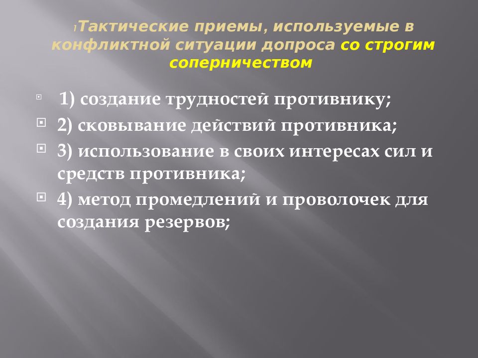 Слайд 37: 1 Тактические приемы, используемые в конфликтной ситуации допроса со строгим соперничеством