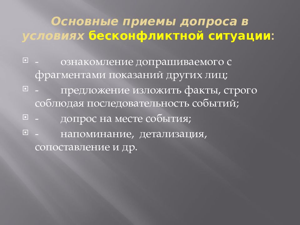Слайд 31: Основные приемы допроса в условиях бесконфликтной ситуации :