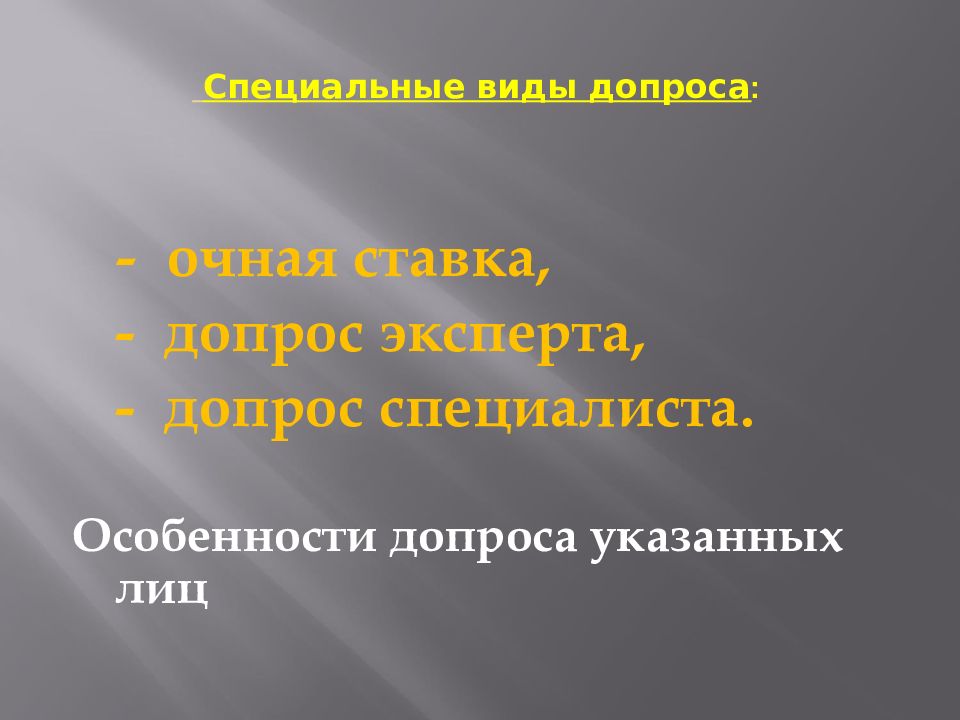 - очная ставка, - допрос эксперта, - допрос специалиста. Особенности допроса указанных лиц