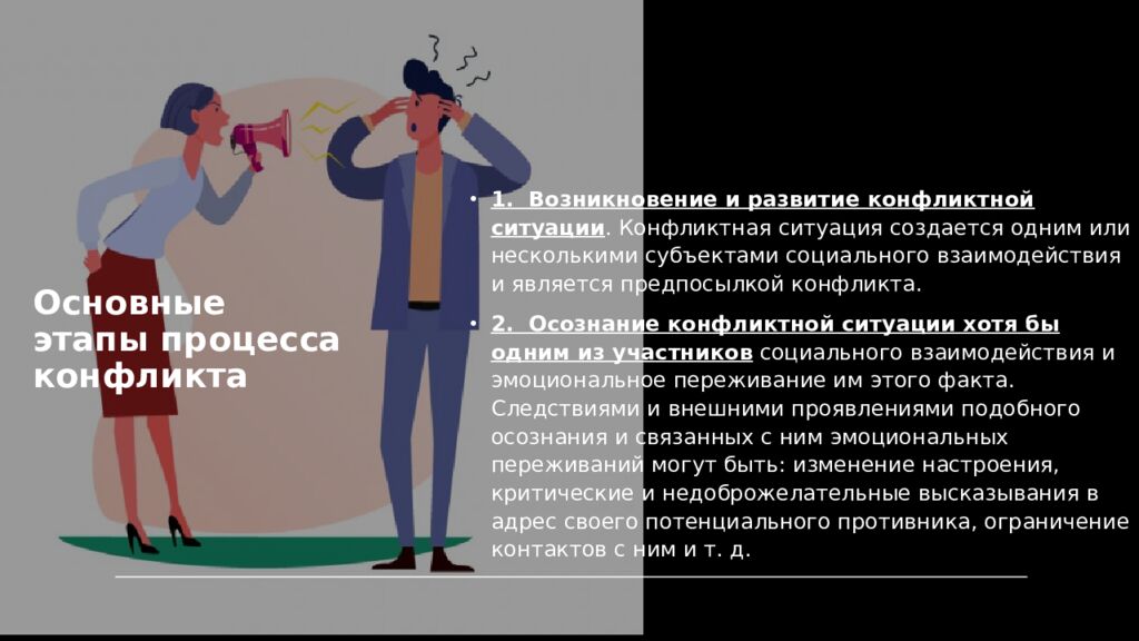 1. Возникновение и развитие конфликтной ситуации. Конфликтная ситуация создается одним или несколькими субъектами социального взаимодействия и является предпосылкой конфликта. 2. Осознание конфликтной ситуации хотя бы одним из участников социального взаимодействия и эмоциональное переживание им этого факта. Следствиями и внешними проявлениями подобного осознания и связанных с ним эмоциональных переживаний могут быть: изменение настроения, критические и недоброжелательные высказывания в адрес своего потенциального противника, ограничение контактов с ним и т. д.