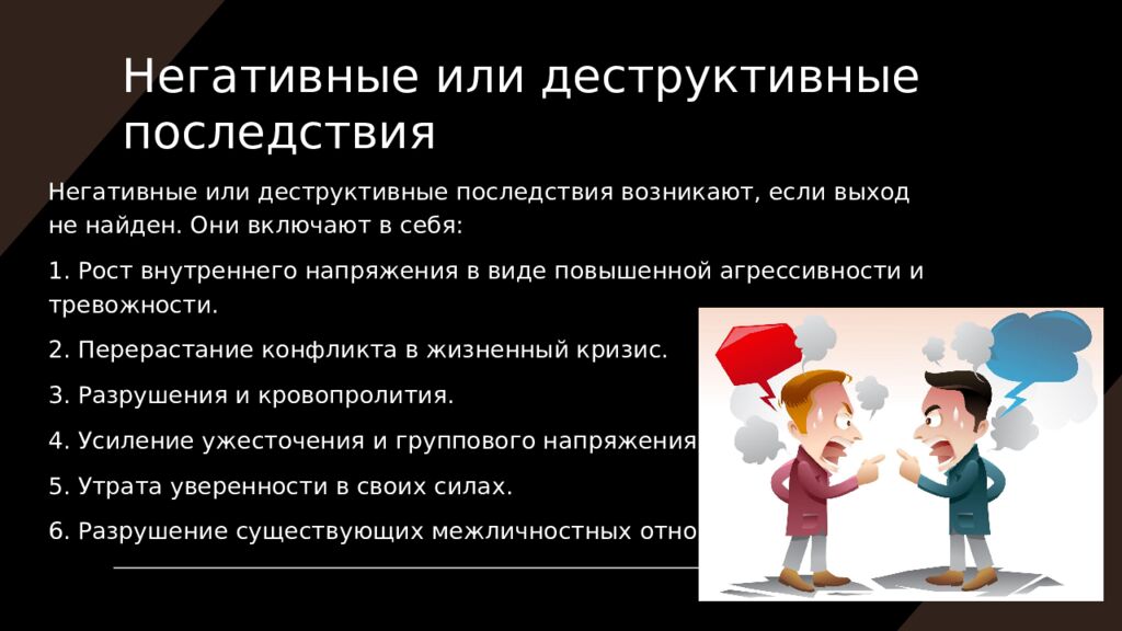 Негативные или деструктивные последствия возникают, если выход не найден. Они включают в себя: 1. Рост внутреннего напряжения в виде повышенной агрессивности и тревожности. 2. Перерастание конфликта в жизненный кризис. 3. Разрушения и кровопролития. 4. Усиление ужесточения и группового напряжения. 5. Утрата уверенности в своих силах. 6. Разрушение существующих межличностных отношений.