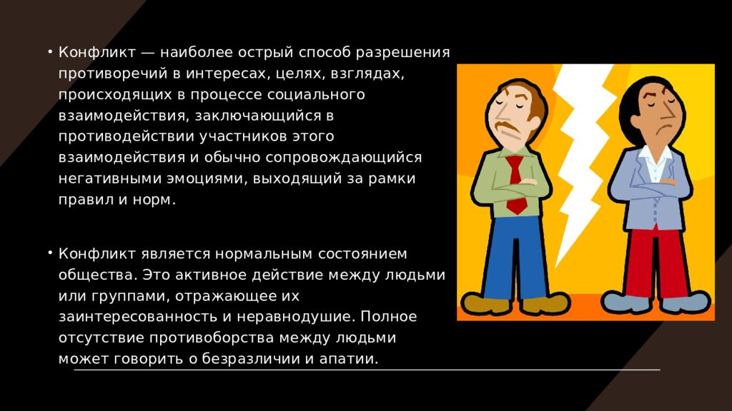 Конфликт — наиболее острый способ разрешения противоречий в интересах, целях, взглядах, происходящих в процессе социального взаимодействия, заключающийся в противодействии участников этого взаимодействия и обычно сопровождающийся негативными эмоциями, выходящий за рамки правил и норм. Конфликт является нормальным состоянием общества. Это активное действие между людьми или группами, отражающее их заинтересованность и неравнодушие. Полное отсутствие противоборства между людьми может говорить о безразличии и апатии.