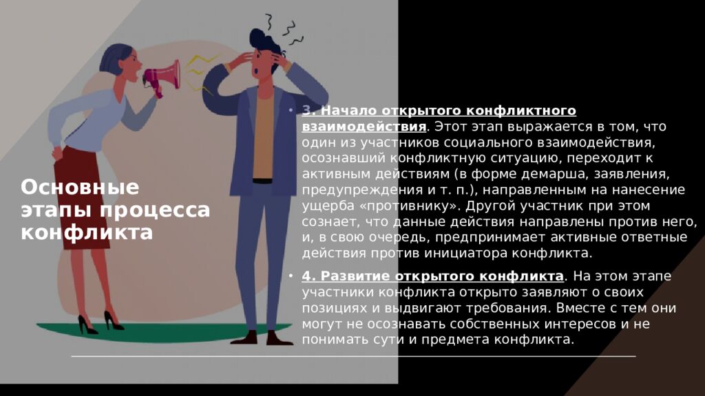 3. Начало открытого конфликтного взаимодействия. Этот этап выражается в том, что один из участников социального взаимодействия, осознавший конфликтную ситуацию, переходит к активным действиям (в форме демарша, заявления, предупреждения и т. п.), направленным на нанесение ущерба «противнику». Другой участник при этом сознает, что данные действия направлены против него, и, в свою очередь, предпринимает активные ответные действия против инициатора конфликта. 4. Развитие открытого конфликта. На этом этапе участники конфликта открыто заявляют о своих позициях и выдвигают требования. Вместе с тем они могут не осознавать собственных интересов и не понимать сути и предмета конфликта. Основные этапы процесса конфликта