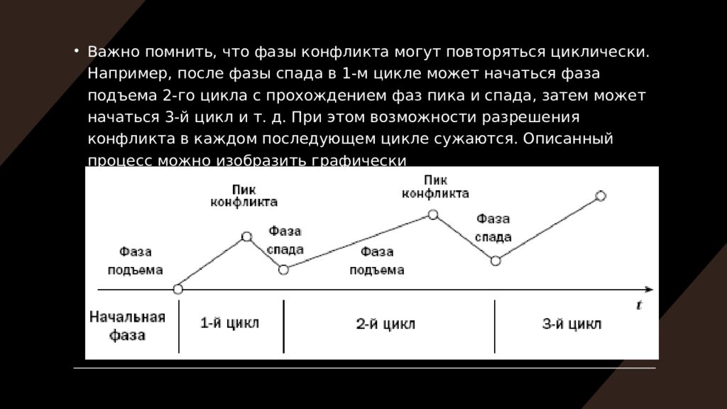 Важно помнить, что фазы конфликта могут повторяться циклически. Например, после фазы спада в 1-м цикле может начаться фаза подъема 2-го цикла с прохождением фаз пика и спада, затем может начаться 3-й цикл и т. д. При этом возможности разрешения конфликта в каждом последующем цикле сужаются. Описанный процесс можно изобразить графически