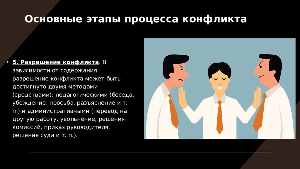 5. Разрешение конфликта. В зависимости от содержания разрешение конфликта может быть достигнуто двумя методами (средствами): педагогическими (беседа, убеждение, просьба, разъяснение и т. п.) и административными (перевод на другую работу, увольнение, решения комиссий, приказ руководителя, решение суда и т. п.). Основные этапы процесса конфликта