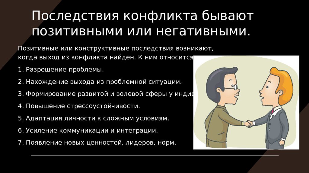 Позитивные или конструктивные последствия возникают, когда выход из конфликта найден. К ним относится: 1. Разрешение проблемы. 2. Нахождение выхода из проблемной ситуации. 3. Формирование развитой и волевой сферы у индивида. 4. Повышение стрессоустойчивости. 5. Адаптация личности к сложным условиям. 6. Усиление коммуникации и интеграции. 7. Появление новых ценностей, лидеров, норм.