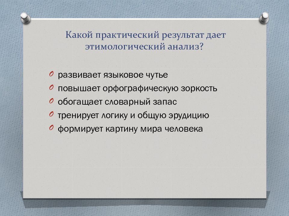 Последний слайд презентации: Этимологический анализ как средство развития грамотности: Какой практический результат дает этимологический анализ?