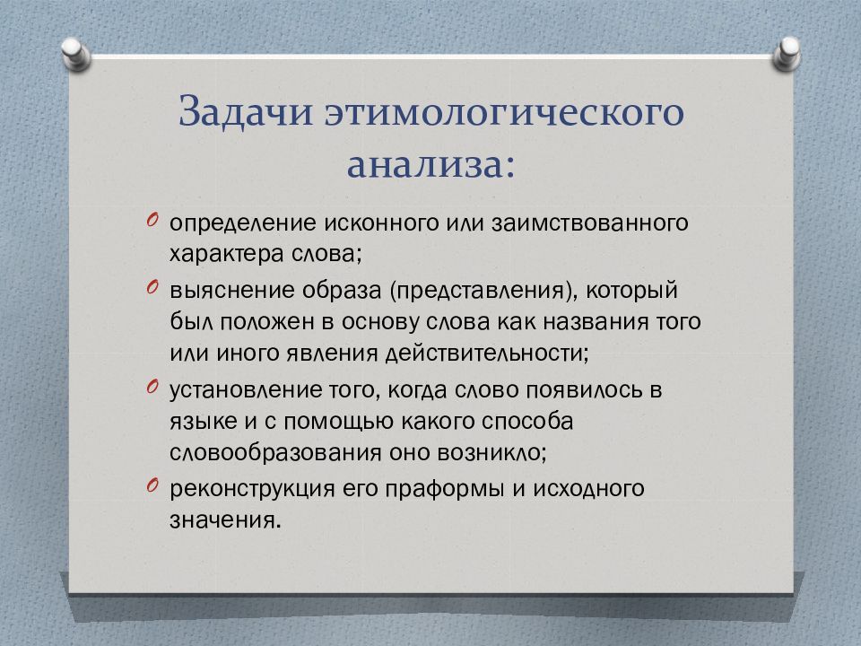 определение исконного или заимствованного характера слова; выяснение образа (представления), который был положен в основу слова как названия того или иного явления действительности; установление того, когда слово появилось в языке и с помощью какого способа словообразования оно возникло; реконструкция его праформы и исходного значения.