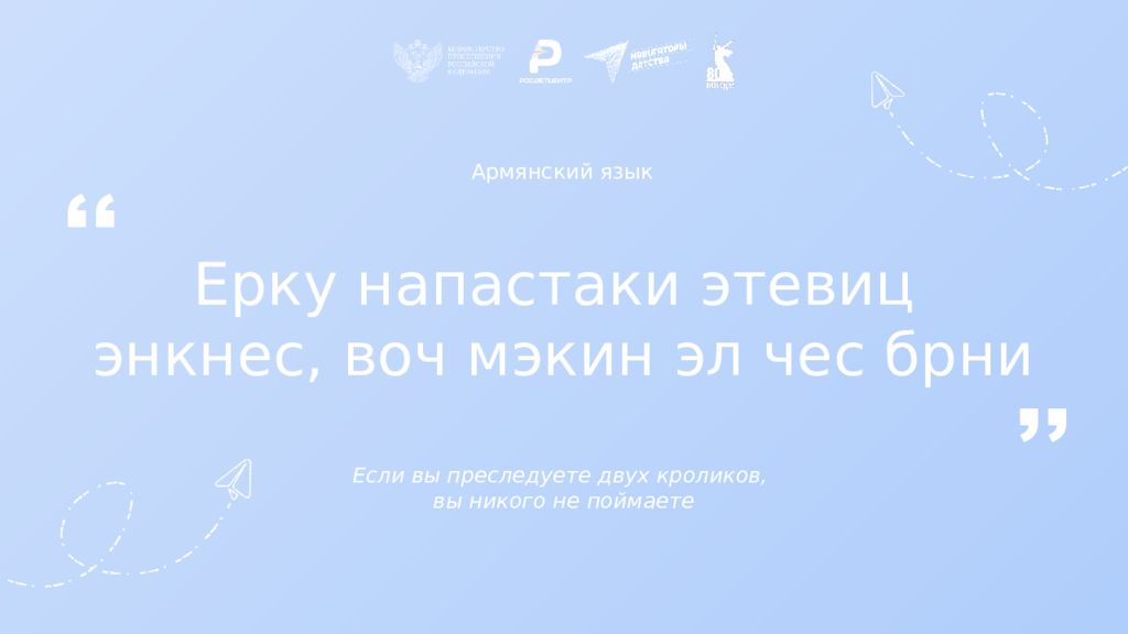 Армянский язык Ерку напастаки этевиц энкнес, воч мэкин эл чес брни Если вы преследуете двух кроликов, вы никого не поймаете ,, ,,