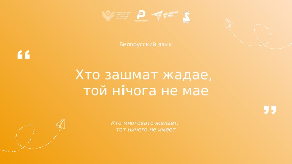 Белорусский язык Хто зашмат жадае, той н і чога не мае Кто многовато желает, тот ничего не имеет ,, ,,