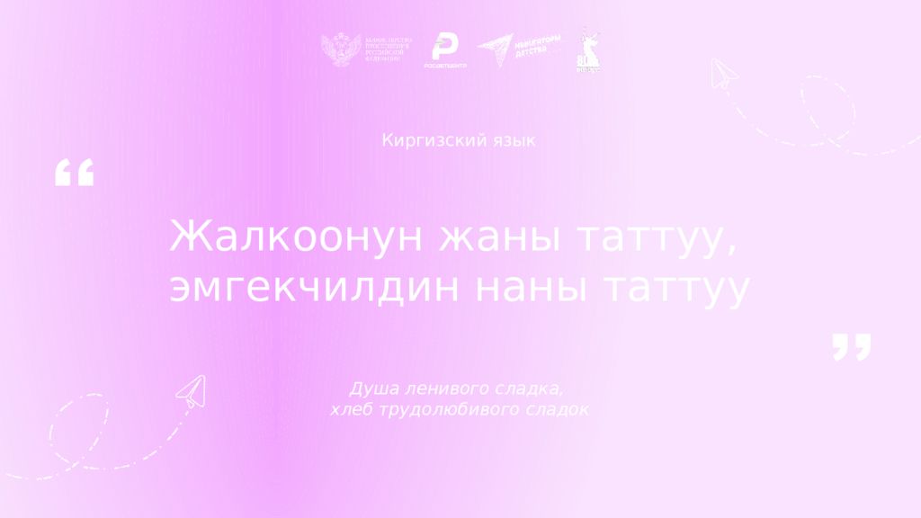 Киргизский язык Жалкоонун жаны таттуу, эмгекчилдин наны таттуу Душа ленивого сладка, хлеб трудолюбивого сладок ,, ,,