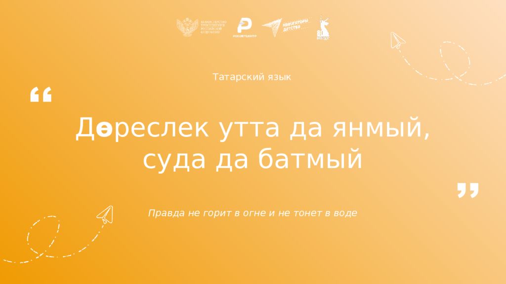 Татарский язык Д ө реслек утта да янмый, суда да батмый Правда не горит в огне и не тонет в воде ,, ,,