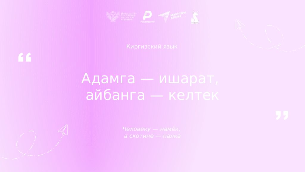 Киргизский язык Адамга — ишарат, айбанга — келтек Человеку — намёк, а скотине — палка ,, ,,