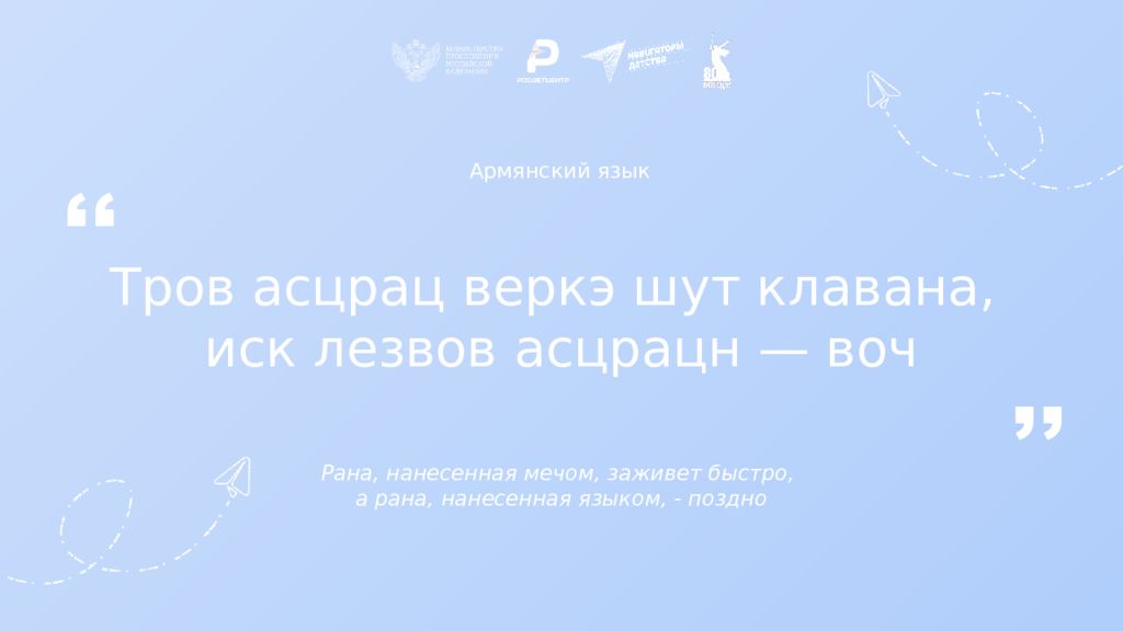 Армянский язык Тров асцрац веркэ шут клавана, иск лезвов асцрацн — воч Рана, нанесенная мечом, заживет быстро, а рана, нанесенная языком, - поздно ,, ,,