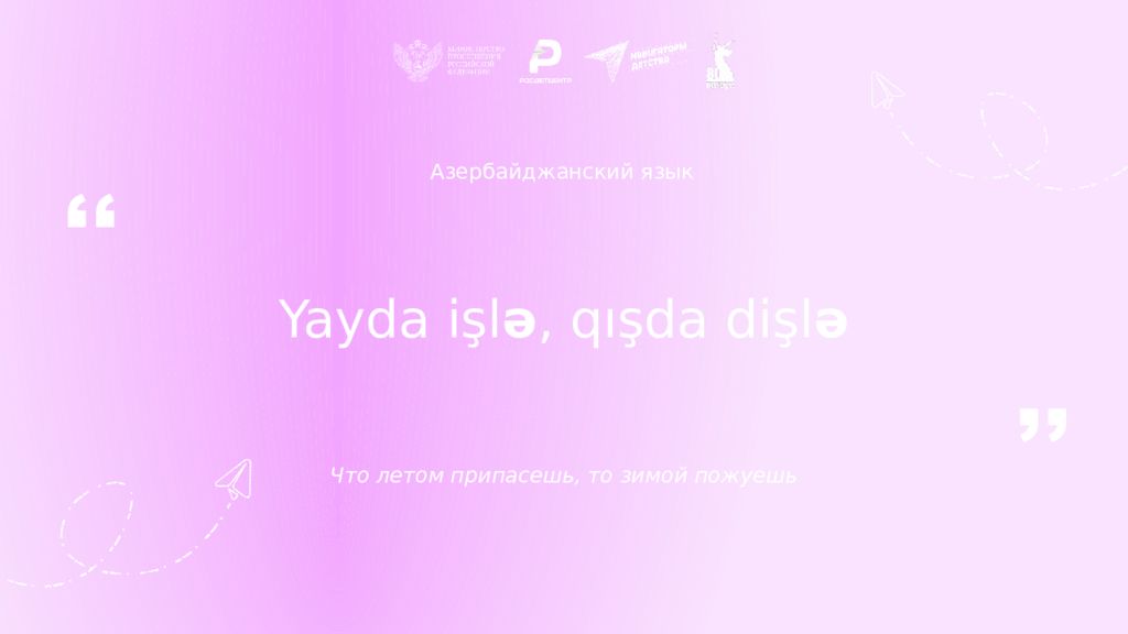 Азербайджанский язык Yayda işl ə, qışda dişl ə Что летом припасешь, то зимой пожуешь ,, ,,