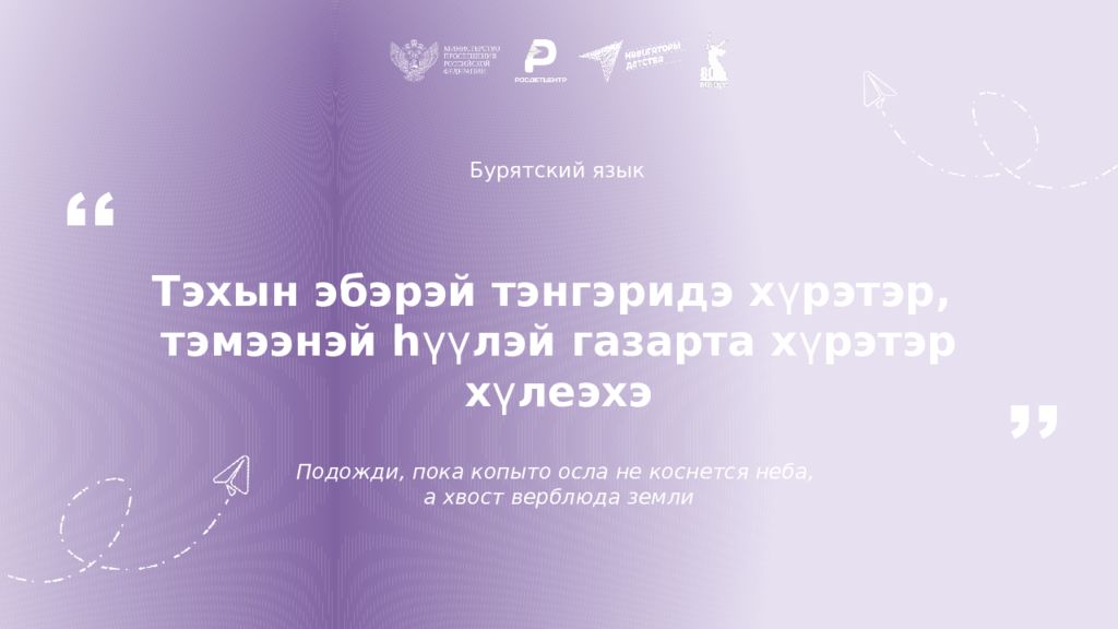 Бурятский язык Тэхын эбэрэй тэнгэридэ х ү рэтэр, тэмээнэй h үү лэй газарта х ү рэтэр х ү леэхэ Подожди, пока копыто осла не коснется неба, а хвост верблюда земли ,, ,,