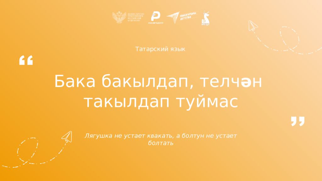 Татарский язык Бака бакылдап, телч ә н такылдап туймас Лягушка не устает квакать, а болтун не устает болтать ,, ,,