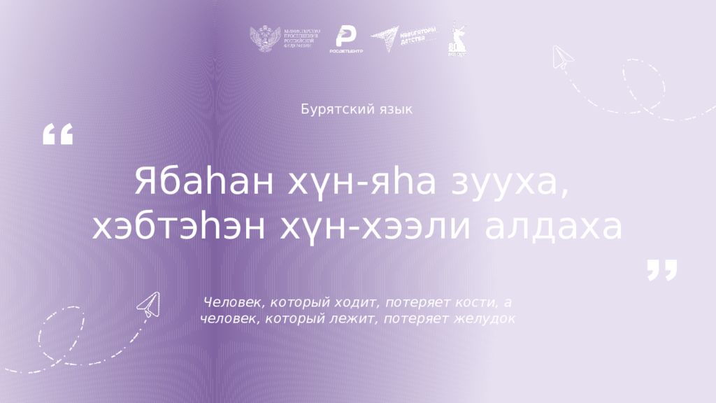 Бурятский язык Яба h ан хүн -я h а зууха, хэбтэ h эн хүн-хээли алдаха Человек, который ходит, потеряет кости, а человек, который лежит, потеряет желудок ,, ,,