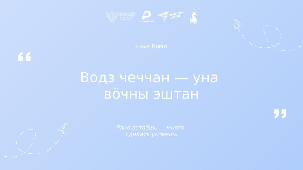 Язык Коми Водз чеччан — уна вöчны эштан Рано встаёшь — много сделать успеешь ,, ,,