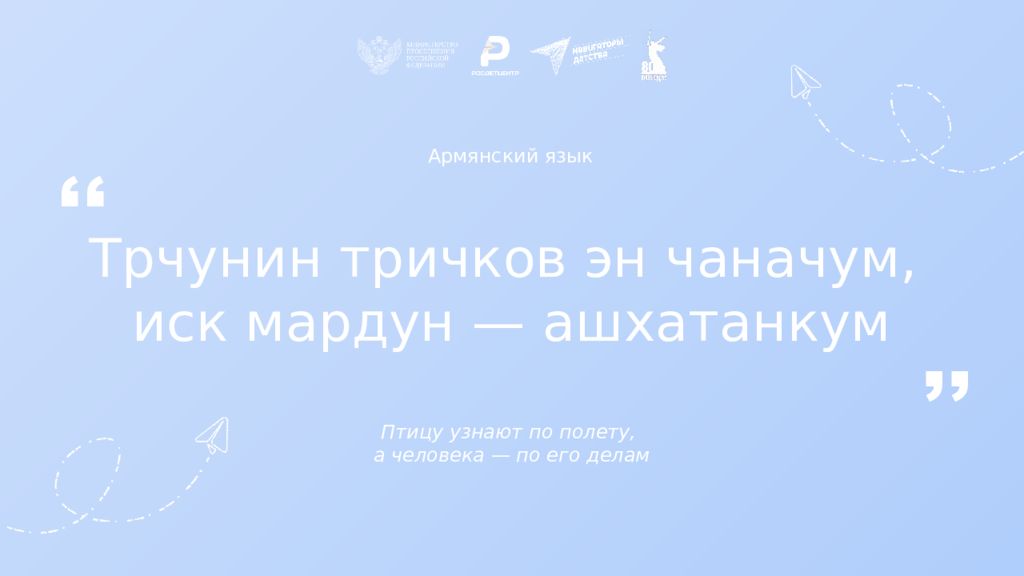 Армянский язык Трчунин тричков эн чаначум, иск мардун — ашхатанкум Птицу узнают по полету, а человека — по его делам ,, ,,