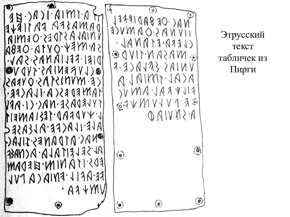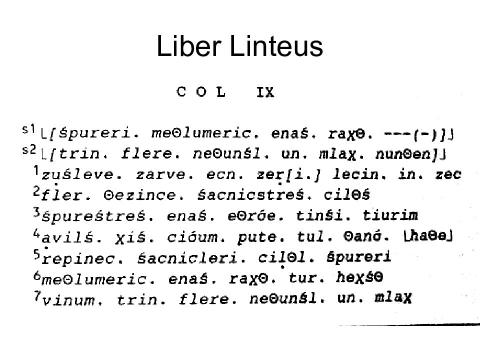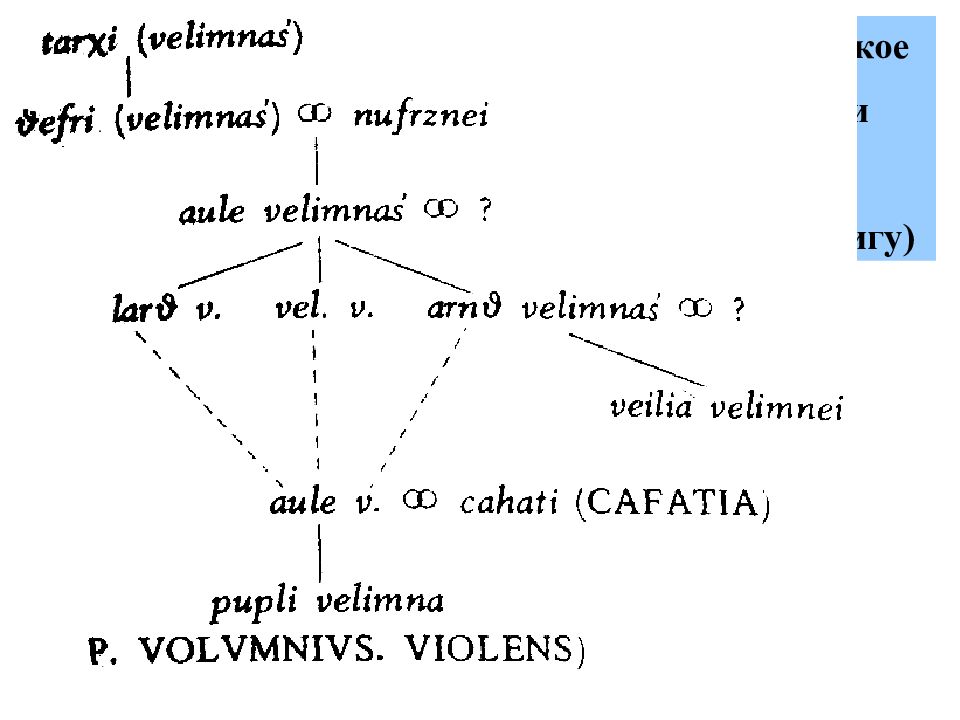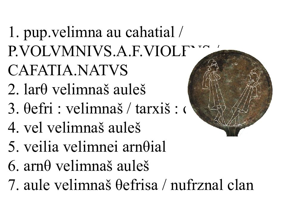 Слайд 12: 1. pup.velimna au cahatial / P.VOLVMNIVS.A.F.VIOLENS / CAFATIA.NATVS 2. lar θ velimna š aule š 3. θ efri : velimna š / tarxi š : clan 4. vel velimna š aule š 5. veilia velimnei arn θ ial 6. arn θ velimna š aule š 7. aule velimna š θ efrisa / nufrznal clan