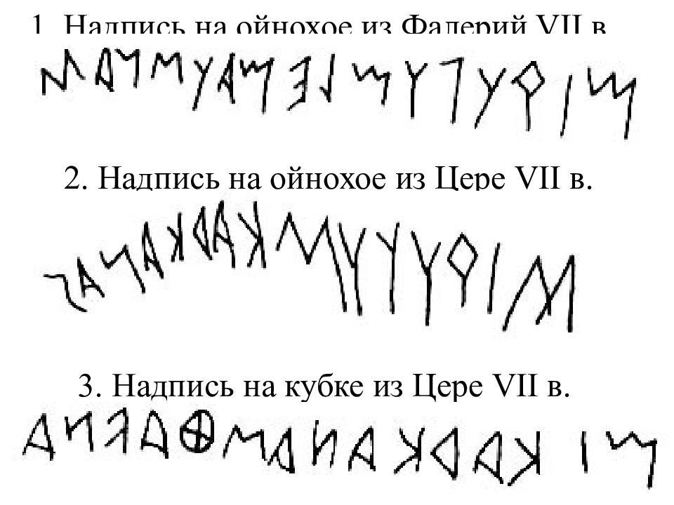 1. Надпись на ойнохое из Фалерий VII в. 2. Надпись на ойнохое из Цере VII в. 3. Надпись на кубке из Цере VII в.