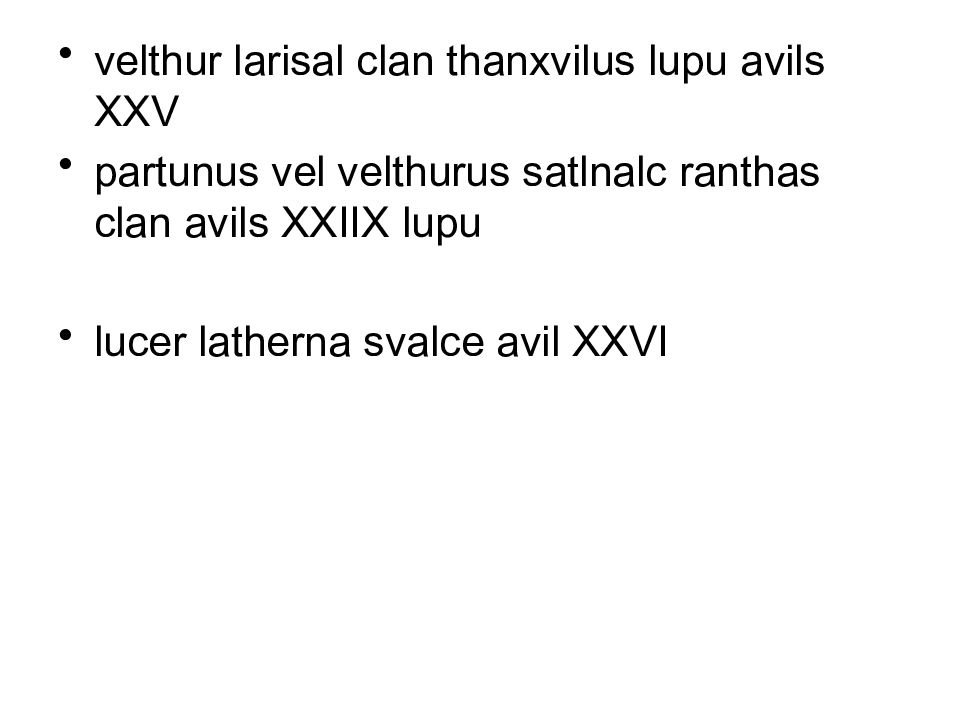 velthur larisal clan thanxvilus lupu avils XXV partunus vel velthurus satlnalc ranthas clan avils XXIIX lupu lucer latherna svalce avil XXVI