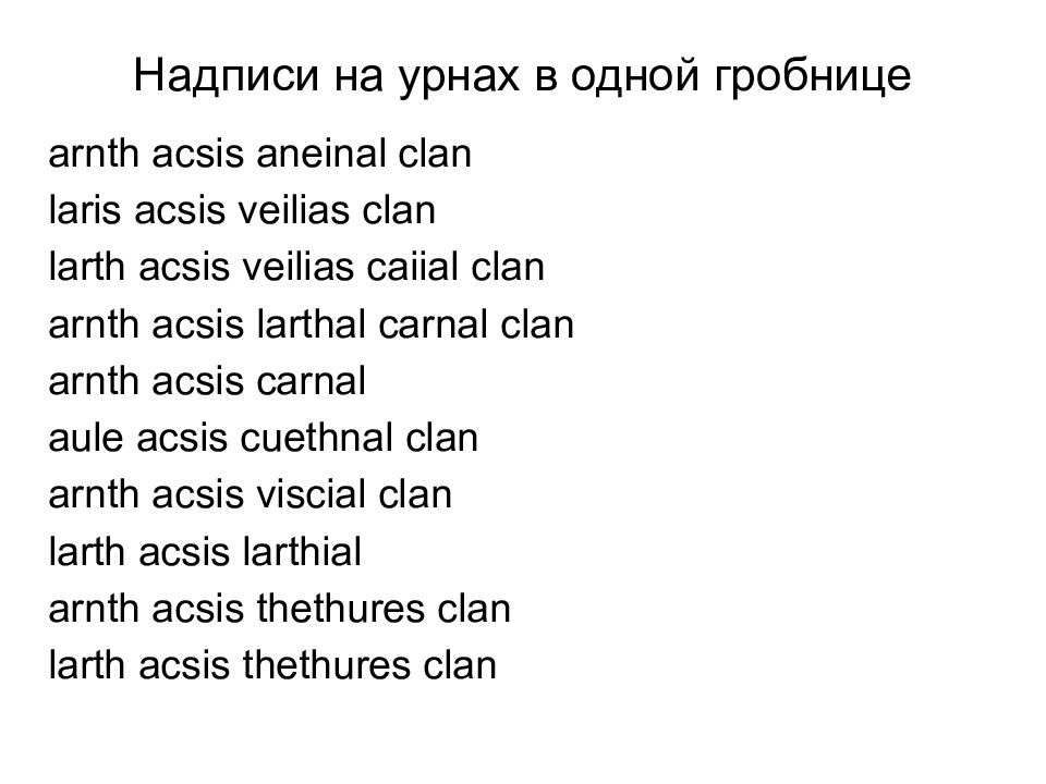 arnth acsis aneinal clan laris acsis veilias clan larth acsis veilias caiial clan arnth acsis larthal carnal clan arnth acsis carnal aule acsis cuethnal clan arnth acsis viscial clan larth acsis larthial arnth acsis thethures clan larth acsis thethures clan Надписи на урнах в одной гробнице