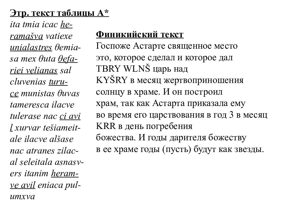 Этр. текст таблицы А* ita tmia icac he- ramašva vatiexe unialastres θemia- sa mex θuta θefa- riei velianas sal cluvenias turu- ce munistas θuvas tameresca ilacve tulerase nac ci avi l xurvar tešiameit- ale ilacve alšase nac atranes zilac- al seleitala asnasv- ers itanim heram- ve avil eniaca pul- umxva Финикийский текст Госпоже Астарте священное место это, которое сделал и которое дал TBRY WLNŠ царь над KYŠRY в месяц жертвоприношения солнцу в храме. И он построил храм, так как Астарта приказала ему во время его царствования в год 3 в месяц KRR в день погребения божества. И годы дарителя божеству в ее храме годы (пусть) будут как звезды.