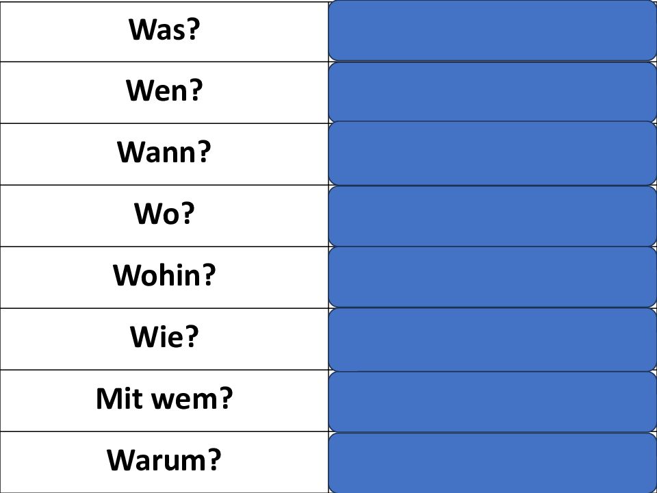 Was? Что? Wen? Кого? Wann? Когда? Wo? Где? Wohin? Куда? Wie? Как? Mit wem? С кем? Warum? Почему?