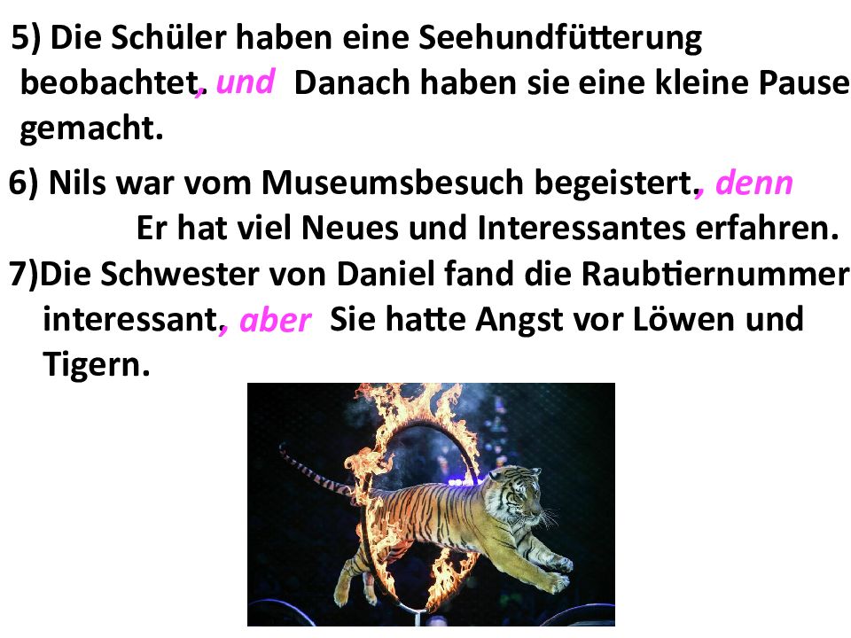 6) Nils war vom Museumsbesuch begeistert. Er hat viel Neues und Interessantes erfahren. 7)Die Schwester von Daniel fand die Raubtiernummer interessant. Sie hatte Angst vor Löwen und Tigern. , denn , aber 5) Die Schüler haben eine Seehundfütterung beobachtet. Danach haben sie eine kleine Pause gemacht. , und