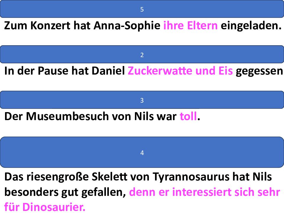 Wen hat Anna-Sophie zum Konzert eingeladen? Zum Konzert hat Anna-Sophie ihre Eltern eingeladen. Was hat Daniel in der Pause gegessen? In der Pause hat Daniel Zuckerwatte und Eis gegessen. Wie war der Museumbesuch von Nils? Der Museumbesuch von Nils war toll. Warum hat das riesengroße Skelett von Tyrannosau - rus Nils besonders gut gefallen? Das riesengroße Skelett von Tyrannosaurus hat Nils besonders gut gefallen, denn er interessiert sich sehr für Dinosaurier. 5 2 3 4