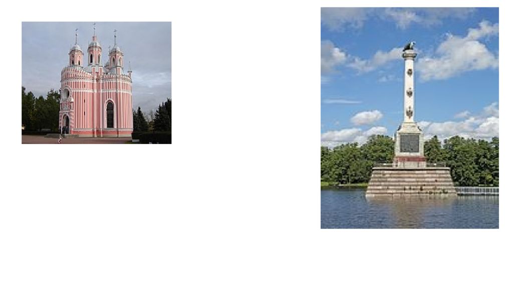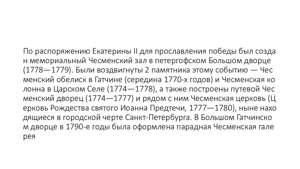 По распоряжению Екатерины II для прославления победы был создан мемориальный Чесменский зал в петергофском Большом дворце (1778—1779). Были воздвигнуты 2 памятника этому событию — Чесменский обелиск в Гатчине (середина 1770-х годов) и Чесменская колонна в Царском Селе (1774—1778), а также построены путевой Чесменский дворец (1774—1777) и рядом с ним Чесменская церковь (Церковь Рождества святого Иоанна Предтечи, 1777—1780), ныне находящиеся в городской черте Санкт-Петербурга. В Большом Гатчинском дворце в 1790-е годы была оформлена парадная Чесменская галерея