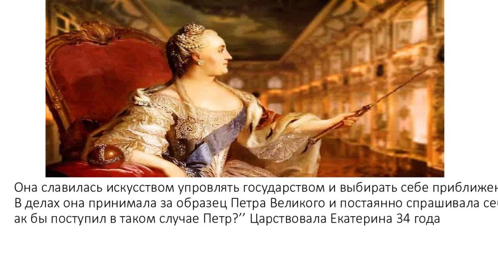 Она славилась искусством упровлять государством и выбирать себе приближенных. В делах она принимала за образец Петра Великого и постаянно спрашивала себя ;” как бы поступил в таком случае Петр ?’’ Царствовала Екатерина 34 года